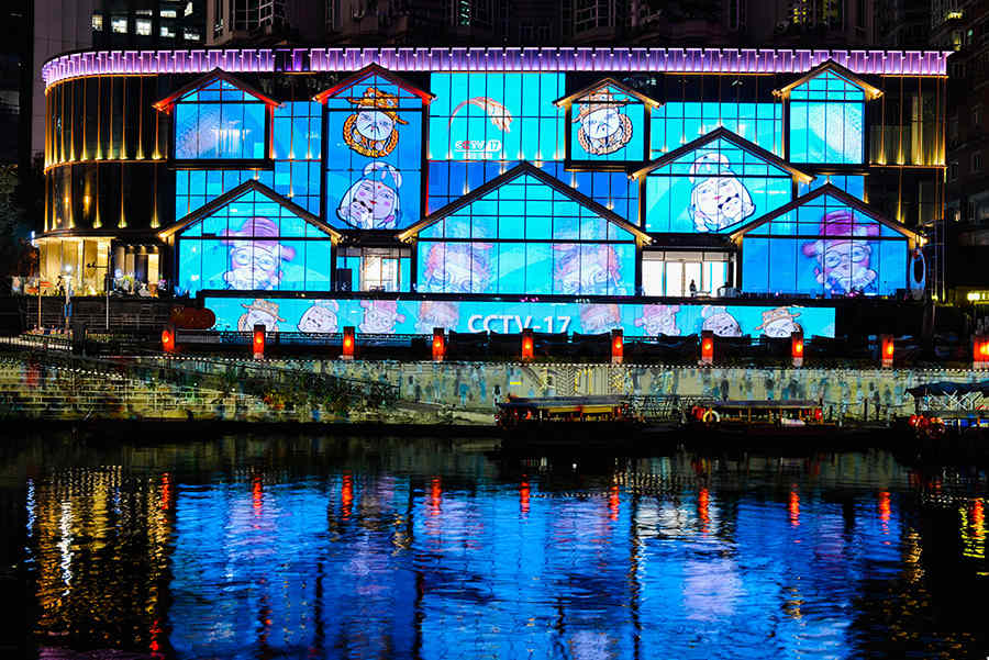 奥蕾达LED透明屏助力成都东门码头全面升级,夜游锦江,沿途两岸的光影秀美轮美奂,以河堤为画布徐徐展开,绚烂夺目,让游客在船程中领略到独特魅力的锦江风情。